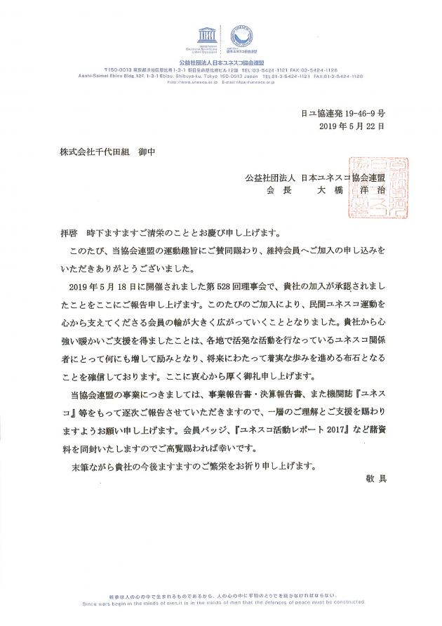 このたび、弊社は日本ユネスコ協会連盟より維持会員への加入が承認されました。この場でご報告申し上げます。詳細は下記をご覧ください。
